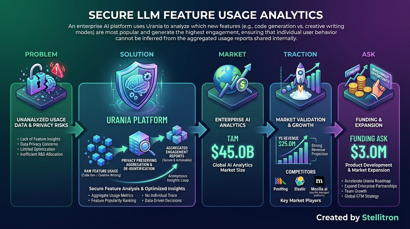 Urania, powered by Stellitron, is a privacy-preserving analytics layer for LLMs. It uses proprietary Differential Privacy (DP) algorithms to aggregate feature usage statistics, guaranteeing that individual user behavior cannot be reverse-engineered from the resulting optimized reports.